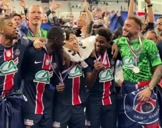 이강인이 25일 프랑스컵 우승 시상식 후 태극기를 목에 두르고 동료들과 우승 축하 세리머니를 즐기고 있다. |