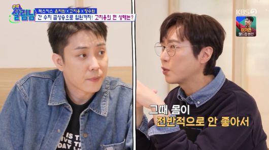 고지용은 "그때 몸이 전반적으로 안 좋아져서. 간 수치가 급성으로 올라갔다. 입원도 했었다"며 "그때보다는 많이 좋아졌다"고 두 사람을 안심시켰다. 이에 은지원은 "걱정했던 것보다는 살이 붙어서 다행"며 안도했다.