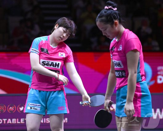 (서울=뉴스1) 사진공동취재단 = 신유빈과 유한나가 24일 카타르 도하 루사일 아레나에서 열린 2025 국제탁구연맹(ITTF) 세계선수권대회 여자복식 4강 소피아 폴차노바(오스트리아)-베르나데트 소츠(루마니와)과 경기에서 실점 후 아쉬워하고 있다. 2025.5.25/뉴스1