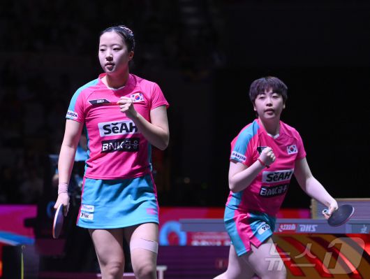 (서울=뉴스1) 사진공동취재단 = 신유빈과 유한나가 24일 카타르 도하 루사일 아레나에서 열린 2025 국제탁구연맹(ITTF) 세계선수권대회 여자복식 4강 소피아 폴차노바(오스트리아)-베르나데트 소츠(루마니와)과 경기에서 득점 후 환호하고 있다. 2025.5.25/뉴스1