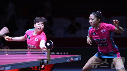 (서울=뉴스1) 사진공동취재단 = 신유빈과 유한나가 24일 카타르 도하 루사일 아레나에서 열린 2025 국제탁구연맹(ITTF) 세계선수권대회 여자복식 4강 소피아 폴차노바(오스트리아)-베르나데트 소츠(루마니와)과 경기를 펼치고 있다. 2025.5.25/뉴스1