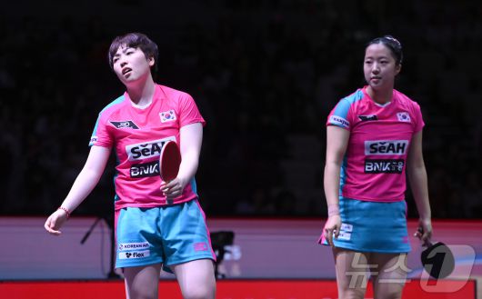 (서울=뉴스1) 사진공동취재단 = 신유빈과 유한나가 24일 카타르 도하 루사일 아레나에서 열린 2025 국제탁구연맹(ITTF) 세계선수권대회 여자복식 4강 소피아 폴차노바(오스트리아)-베르나데트 소츠(루마니와)과 경기에서 실점 후 아쉬워하고 있다. 2025.5.25/뉴스1