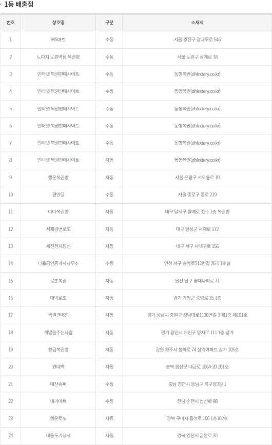 로또 1등 당첨자를 배출한 곳은 서울 광진구 광나루로 'MS마트', 서울 노원구 상계로 '노다지 노원역점 복권방', 서울 은평구 서오릉로 ‘행운복권방’, 서울 종로구 종로 ‘평안당’, 경기 가평군 중앙로 ‘대박로또’, 경기 성남시 중원구 성남대로 ‘복권판매점’, 경기 용인시 처인구 양지로 ‘희망을주는사람’, 대구 달서구 월배로 '다다복권방', 대구 달성군 서재로 '서재강변로또', 대구 서구 서대구로 ‘세진전자통신’, 인천 서구 승학로512번길 ‘다올공인중개사사무소’, 울산 남구 꽃대나리로 ‘로또복권’, 강원 원주시 봉화로 ‘황금복권방’, 충북 음성군 대금로 ‘원대박’, 충남 천안시 동남구 복구정3길 ‘대산슈퍼’, 전남 순천시 삼산로 ‘내가마트’, 경북 구미시 들성로 ‘행운로또’, 경북 영천시 금완로 ‘대동도기상사’, 인터넷 복권판매사이트 ‘동행복권’ 6명 등 24곳이다.