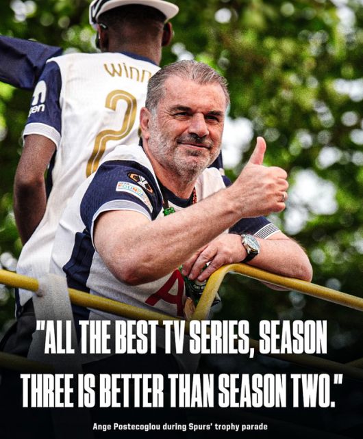 토트넘 우승 퍼레이드에서 포스테코글루 감독은 "모든 훌륭한 프로그램은 시즌 2보다 시즌 3가 낫다. 역사엔 우리가 우승이라는 사실만 남는다. 어떻게 우승했는지는 적혀있지 않다"라고 밝혔다.