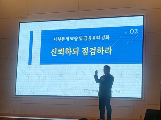 이번 교육은 '실제 사례로 배우는 내부통제와 금융사고 예방' 중심으로 성수용 금융감독원 금융교육국 선임교수가 강의하고 금융회사 임직원으로서 지켜야 할 원칙과 행동을 제시했다.