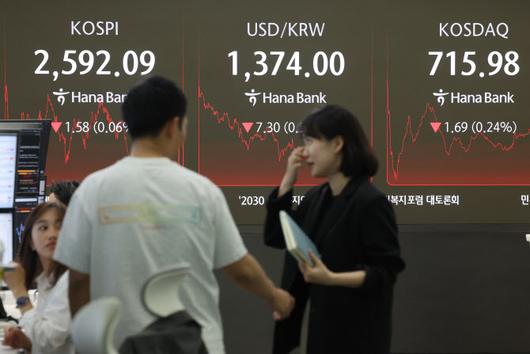 23일 서울 중구 하나은행 딜링룸 현황판에 코스피·코스닥 지수 종가가 표시돼있다.(사진=연합뉴스) |