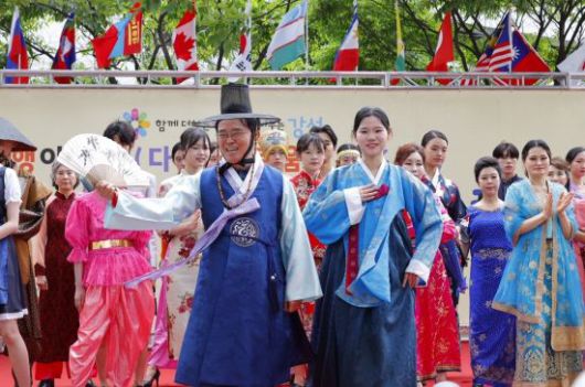 진교훈 서울 강서구청장(맨앞 왼쪽)이 24일 '제10회 다문화 축제 및 가족 행사'에서 한복을 차려 입고 '세계 전통 의상 패션쇼'에 올라 포즈를 취하고 있다. 강서구 제공. |