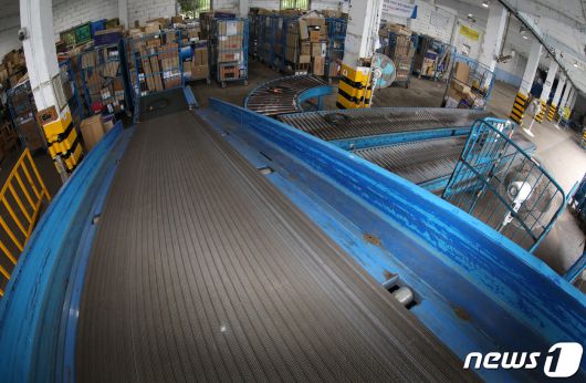 서울 시내의 한 택배 물류센터에 텅 빈 컨베이어 벨트 뒤로 택배상자가 쌓여있다. /뉴스1 ⓒ News1 이동해 기자 |