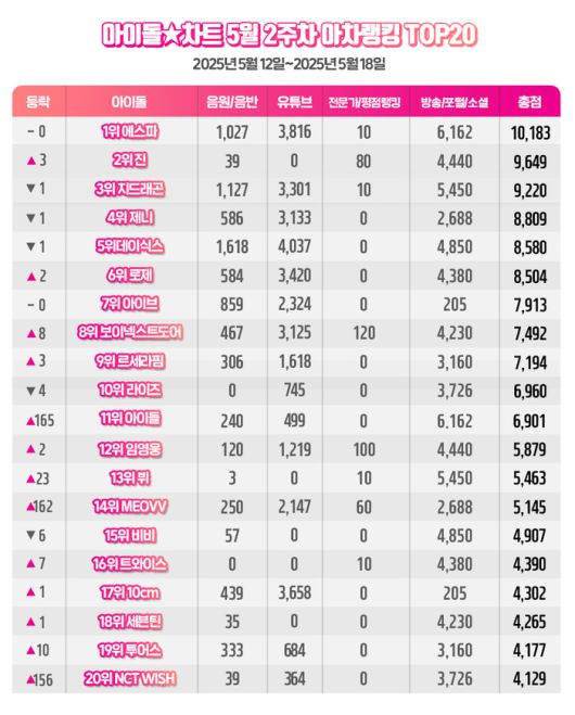 에스파는 24일 발표된 아이돌차트 5월 2주차(5월 12일~5월 18일) 아차랭킹에서 음원 점수 1027점, 유튜브 점수 3816점, 소셜 점수 5330점 등 총점 1만 183점으로 1위를 기록했다.