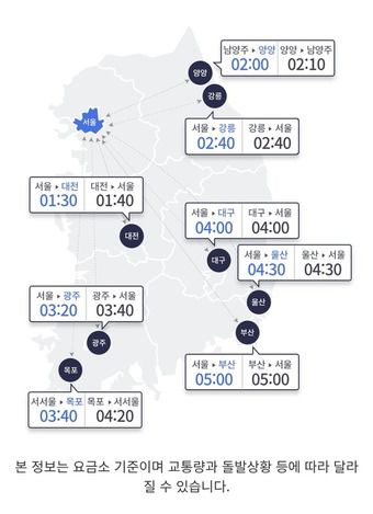 같은 시각 지방 도시에서 서울까지는 △부산 5시간 △울산 4시간 30분 △강릉 2시간 40분 △양양 2시간 10분(남양주 도착) △대전 1시간 40분 △광주 3시간 40분 △목포 4시간 20분(서서울 도착) △대구 4시간이다.