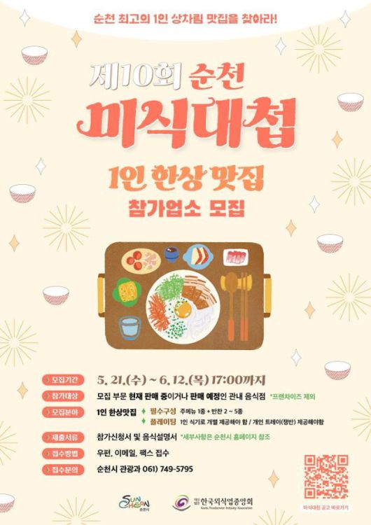 순천시가 개인 맞춤형 외식문화 확산에 발맞춰 ‘1인 상차림’을 주제로 제10회 순천미식대첩을 개최한다.