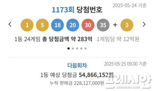 25일 동해복권에 따르면 지난 24일 오후 제1173회 로또복권 추첨한 결과 당첨 번호 6개를 모두 맞힌 1등 당첨자는 24명으로 각각 11억 7994만원의 당청금을 받는다. 1등 당첨 번호는 1,5,18,20,30,35번이다.