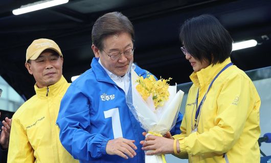 | 더불어민주당 이재명 대선 후보가 24일 경기 안산시 단원구 안산문화광장에서 열린 유세에서 세월호 참사 유가족인 정부자씨로부터 프리지어 꽃을 받고 있다. / 사진 = 연합뉴스 |
