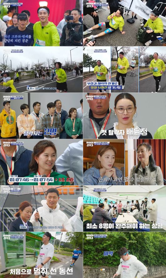 그런가 하면, 율희는 마라톤 중반 고비를 맞아 계속 눈물을 쏟았지만 악으로 깡으로 결승선을 통과했다. 곧장 바닥에 쓰러져 응급구조대 처치까지 받은 그는 제작진과의 인터뷰에서 앞서 오열했던 이유에 대해 "눈앞에 아이들 얼굴이 스쳐지나가면서 갑자기 울컥하는 거다. 숨 쉬는 것도 힘들고, 감정도, 호흡도, 내 몸도 컨트롤할 수 없어 괴로웠다"고 털어놨다. 손정은, 김승진, 안성훈 역시 각자의 고비를 넘기며 완주했고, '하위권 그룹' 허재, 양준혁, 최준석도 지옥 훈련 덕분인지 마지막까지 투혼을 발휘했다.