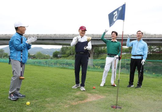 [서울=뉴시스] 가족파크골프대회. (오른쪽부터) 경기에 참석한 허대무 강남체육회장, 정준호 강남구 홍보대사, 조성명 강남구청장, 강완식 강남파크골프협회장. 2025.05.25. (사진=강남구 제공) *재판매 및 DB 금지 |