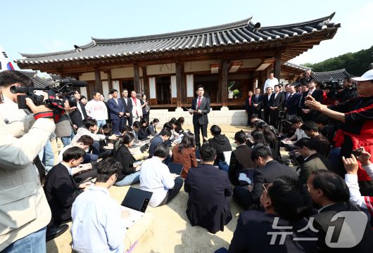 (옥천=뉴스1) 김민지 기자 = 김문수 국민의힘 대통령 후보(오른쪽)가 25일 오전 충북 옥천군 박정희 전 대통령의 부인 육영수 여사 생가를 둘러본 뒤 현안 관련 브리핑을 하고 있다. 2025.5.25/뉴스1