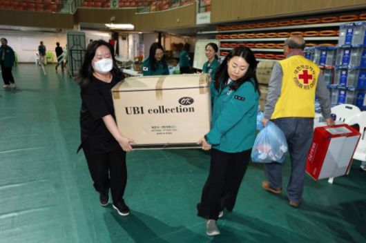 광주 광산구 공직자들이 광주여대 체육관 임시대피소에서 구호 물품을 옮기고 있다. 광산구 제공 |