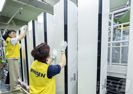 (서울=뉴스1) = 평년을 웃도는 덥고 습한 날씨 영향으로 LG 휘센 스탠드 에어컨의 1~4월 누적 판매량이 전년 동기 대비 45% 증가했다. 사진은 LG전자 직원들이 경남 창원의 LG전자 에어컨 생산라인에서 스탠드 에어컨을 생산하고 있는 모습. (LG전자 제공, 재판매 및 DB금지) 2025.5.25/뉴스1