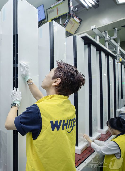 (서울=뉴스1) = 평년을 웃도는 덥고 습한 날씨 영향으로 LG 휘센 스탠드 에어컨의 1~4월 누적 판매량이 전년 동기 대비 45% 증가했다. 사진은 LG전자 직원들이 경남 창원의 LG전자 에어컨 생산라인에서 스탠드 에어컨을 생산하고 있는 모습. (LG전자 제공, 재판매 및 DB금지) 2025.5.25/뉴스1
