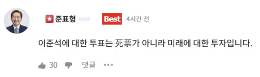 홍준표 전 대구시장은 25일 지지자 소통 채널인 ‘청년의 꿈’에 “이준석에 대한 투표는 사표(死票)가 아니라 미래에 대한 투자”라고 했다.