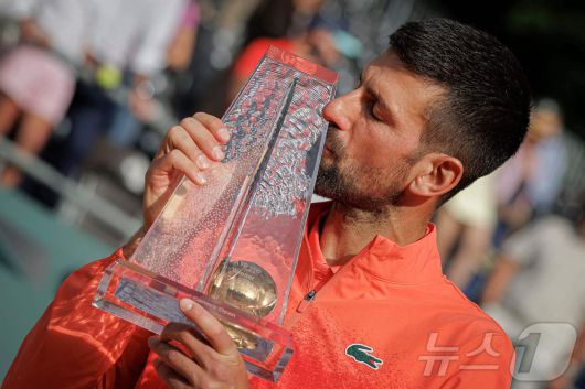 (제네바 AFP=뉴스1) 우동명 기자 = 세르비아의 노바크 조코비치가 24일(현지시간) 스위스 제네바에서 열린 ATP 투어 제네바 오픈 결승서 폴란드의 후베르트 후르카치를 꺾고 ATP 투어 이상급 대회 단식 100회째 우승 트로피에 입을 맞추고 있다. 2025.05.25 ⓒ AFP=뉴스1