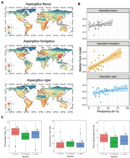 연구자들은 인간, 가축, 식물 등에 심각한 감염을 일으키는 아스페르길루스 속(屬)의 병원성 곰팡이 3개 종의 지리적 분포가 기후변화 시나리오에 따라 어떻게 변할지 시뮬레이션을 했다.