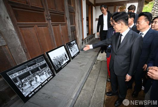 [옥천=뉴스핌] 최지환 기자 = 김문수 국민의힘 대선 후보가 25일 오전 충북 옥천군 육영수 여사 생가를 찾아 관계자의 설명을 들으며 생가를 둘러보고 있다. 2025.05.25 choipix16@newspim.com