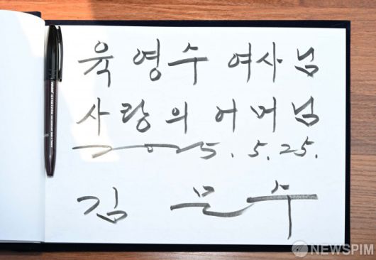 [옥천=뉴스핌] 최지환 기자 = 김문수 국민의힘 대선 후보가 25일 오전 충북 옥천군 육영수 여사 생가를 찾아 참배한 뒤 남긴 방명록. 2025.05.25 choipix16@newspim.com |