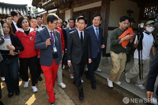 [옥천=뉴스핌] 최지환 기자 = 김문수 국민의힘 대선 후보가 25일 오전 충북 옥천군 육영수 여사 생가를 찾아 관계자의 설명을 들으며 생가를 둘러보고 있다. 2025.05.25 choipix16@newspim.com