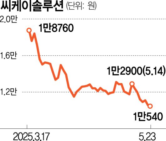 25일 한국거래소에 따르면 씨케이솔루션 주가는 23일 1만 540원에 거래를 마쳤다. 회사가 주가 안정 및 주주가치 제고를 위해 20억 원 규모의 자사주 취득 결정 공시를 냈지만 주가는 오히려 직전 거래일 대비 0.38% 떨어졌다. 씨케이솔루션은 공모가 1만 5000원으로 3월 17일 코스피 시장에 상장했다. 주가는 공모가와 비교하면 29.7% 떨어졌다. 상장일 최고 2만 8000원까지 올랐던 주가는 급락세로 전환해 같은 달 28일부터 공모가를 하회했고 지금까지 단 한번도 공모가를 회복하지 못했다.
