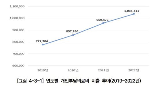 가계 부담 의료비는 2019년 208만 원에서 3년 새 42.6% 증가했고, 가구원 1인당 기준으로는 2019년 약 78만 원에서 33.2% 증가했습니다.