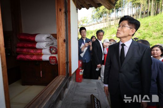 [옥천=뉴시스] 권창회 기자 = 김문수 국민의힘 대선 후보가 25일 오전 충북 옥천군 고(故) 육영수 여사 생가를 방문해 내부를 둘러보고 있다. 2025.05.25. kch0523@newsis.com |