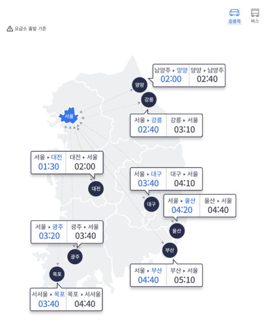 오전 10시 기준 서울에서 지방 주요 도시까지 승용차 운행 시 예상 소요 시간은 ▲부산 4시간 40분 ▲울산 4시간 20분 ▲강릉 2시간 40분 ▲양양 2시간(남양주 출발) ▲대전 1시간 30분 ▲광주 3시간 20분 ▲목포 3시간 40분(서서울 출발) ▲대구 3시간 40분이다.