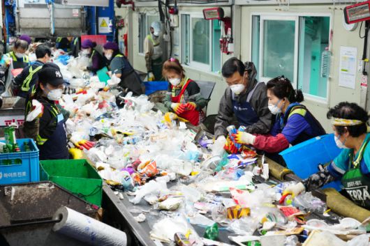 흰 마스크를 낀 이승로 성북구청장(오른쪽 세번째)이 청소공무관들과 함께 쓰레기 분류작업을 하고 있다./성북구 |