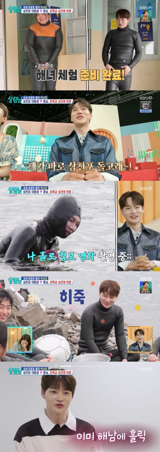 박서진은 숨참기부터 소질을 보였고 수직 잠수까지 한 번에 성공하며 빠르게 바다에 적응했다. 이어 멍게와 해삼까지 거뜬하게 채취한 박서진은 "해남해도 되겠다"는 해녀의 칭찬을 이끌어내기도. 기본기부터 센스까지 모두 갖춘 그의 모습은 삼천포 돌고래 그 자체였다. '살림남'을 통해 다재다능한 면모를 보여줬던 박서진의 완벽한 물질은 또 한 번 시청자들의 마음을 설레게 만들었다.