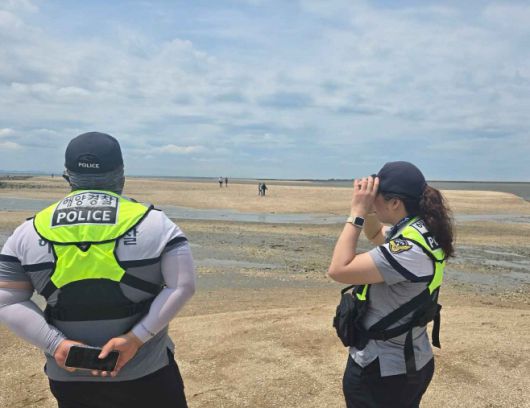 평택해양경찰서 평택파출소 경찰관들이 25일 연안사고 예방을 위해 간조 시 해안가를 순찰하고 있다 . /평택해경 |