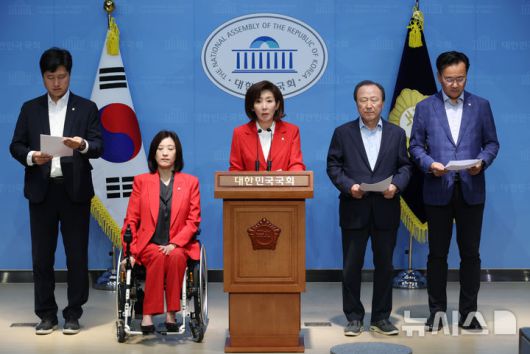 [서울=뉴시스] 고승민 기자 = 국민의힘 나경원, 유상범, 우재준, 최보윤 의원이 25일 서울 여의도 국회 소통관에서 현안 기자회견을 하고 있다. 2025.05.25. kkssmm99@newsis.com |