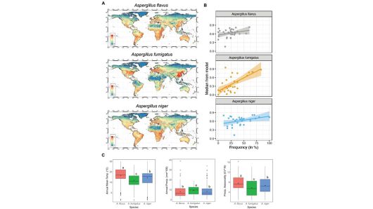연구자들은 인간, 가축, 식물 등에 심각한 감염을 일으키는 아스페르길루스 속(屬)의 병원성 곰팡이 3개 종(種)의 지리적 분포가 기후변화 시나리오에 따라 어떻게 변할지 시뮬레이션을 진행했습니다.