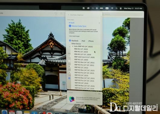 실제로 MA시리즈 모니터와 애플 디바이스를 연동해 활용하는 방법은 간단하다. 두 장치에 탑재된 타입C(TypeC) 기반 포트를 연결하면 연동 앱인 디스플레이 파일럿2가 작동해 자동으로 ICC 프로파일을 감지하고 적용, 애플 디바이스 내장 디스플레이와의 색상을 일치시킨다. 다만 모델명이 다양한 맥북의 경우는 일부 직접 조정해주는 작업이 필요하다. 앱 내에서 모델명을 사용자가 쓰는 제품으로 일치시키는 식으로다. 아이폰이나 아이패드의 경우 별도의 모델 설정 없이도 자동으로 인식한다.