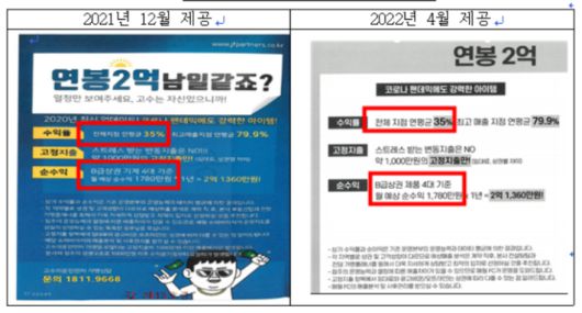 또한 2022년 1월부터 10월까지 가맹희망자에게 제공한 창업안내서의 경우 기존 가맹점들의 연평균 수익률을 안내하면서 기준시점 2020년을 의도적으로 누락한 채 '전체 지점 연평균 35%'라고 표기했다. 2021년 전체 가맹점들의 연평균 수익률은 -7.1%로 큰 차이가 있었다.