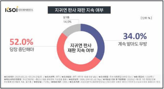 지귀연 재판, '중단해야' 52% '계속 맡아야' 34%