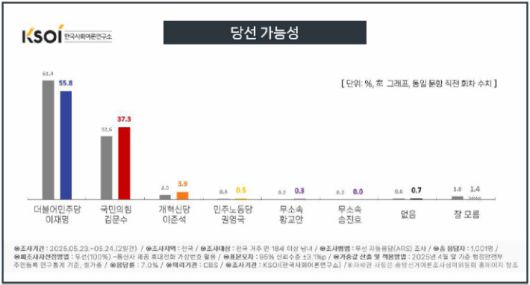 김 후보의 상승세에도 당선 가능성은 이재명 후보가 여전히 과반 이상의 응답률로 1위를 달렸다. 당선 가능성 조사에서 이재명 후보는 55.8%, 김 후보는 37.3%, 이준석 후보는 3.9%를 각각 얻었다.