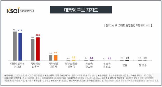 6·3 조기대선을 9일 앞둔 25일 더불어민주당 이재명 대선 후보와 국민의힘 김문수 대선 후보 간 지지율 격차가 한자릿수대 %포인트(p)까지 좁혀졌다는 여론조사 결과가 나왔다.