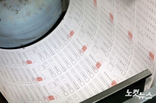 제21대 대통령선거를 9일 앞둔 25일 오전 경기 안양시 동안구 한 인쇄소에서 투표용지가 인쇄되고 있다.