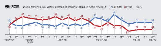 아시아투데이 이한솔 기자 = 25일 더불어민주당과 국민의힘에 대한 정당지지도 격차가 직전 조사(20일 실시) 대비 소폭 좁혀져 5%p(포인트) 차로 격차를 보인 여론조사가 공개됐다. 이번 조사는 아시아투데이가 한국여론평판연구소(KOPRA)에 의뢰해 24일 전국 만 18세 이상 남녀 1001명을 대상으로 진행됐다.