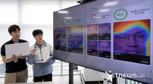 제21대 대통령선거를 앞두고 딥페이크 기술을 악용한 디지털 범죄에 대한 우려가 커지면서 업계가 관련 기술 연구에 매진하고 있다. 경기 과천시 샌즈랩에서 연구원이 딥페이크 합성 탐지 솔루션 '페이크체크'의 기능을 테스트하고 있다. 김민수기자 mskim@etnews.com [Copyright © 전자신문. 무단전재-재배포금지]