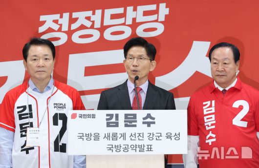 [계룡=뉴시스] 권창회 기자 = 김문수 국민의힘 대선 후보가 25일 오전 충남 계룡시 계룡 병영체험관에서 국방 공약을 발표하고 있다. 2025.05.25. kch0523@newsis.com |
