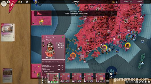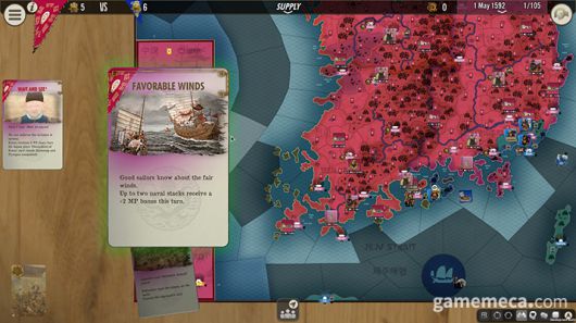 지도에는 한반도 주요 지역 7곳이 있고, 지도 밖에도 만주, 중국과 일본 인근 지역, 넓은 해상이 있다. 병력을 확보하며 주요 도시를 점령해 전쟁에서 승리하는 것이 주목표다. 특히 한국에는 이순신 장군, 거북선 등이 등장하며, 의병장 곽재우와 일본 안코우지 에케이가 맞붙는 정암진 전투 등 주요 전투도 경험할 수 있다. 여기에 날씨, 수입, 외교, 전투 등에 대한 다양한 카드도 활용할 수 있다.