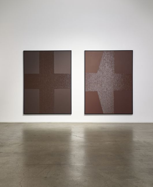 매끈한 갈색 화면 한가운데 십자 모양으로 오톨도톨하게 물감을 쌓아 올렸다. 차분하게 가라앉은 화면에서 가운데 튀어나온 면만이 서성이는 관객을 따라 빛나듯 일렁인다. 오정근(55)의 '사이공간 베를린(유대인 박물관)'이다. 세로 2m 캔버스에 묽게 희석한 물감을 매끈하게 바르고, 가운데는 0~1호 세필로 일일이 수놓듯 그렸다.