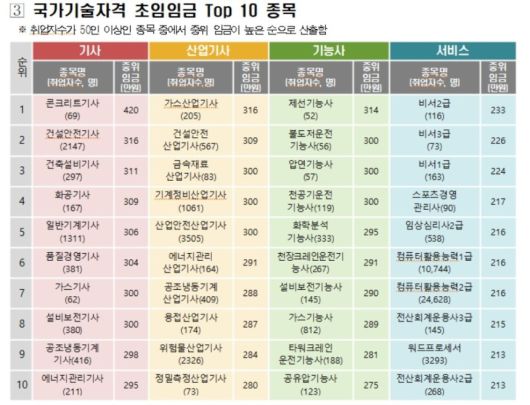 종목별(취업인원 50인 이상)로는 기사 등급에서는 콘크리트기사가 월 420만원으로 가장 높았다. 산업기사 등급은 가스산업기사 316만원, 기능사는 제선기능사 314만원, 서비스는 비서2급 233만원이 가장 높은 것으로 나타났다.